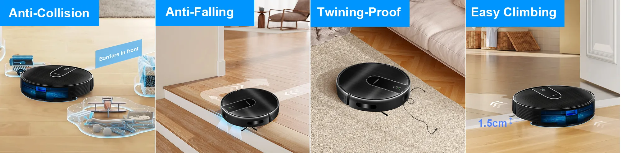 Don't let thresholds stand in the way of a complete clean. With 1.5cm Easy Climbing, this robot vacuum smoothly glides over rugs, carpets, and door sills, ensuring continuous cleaning throughout your home without getting stuck.